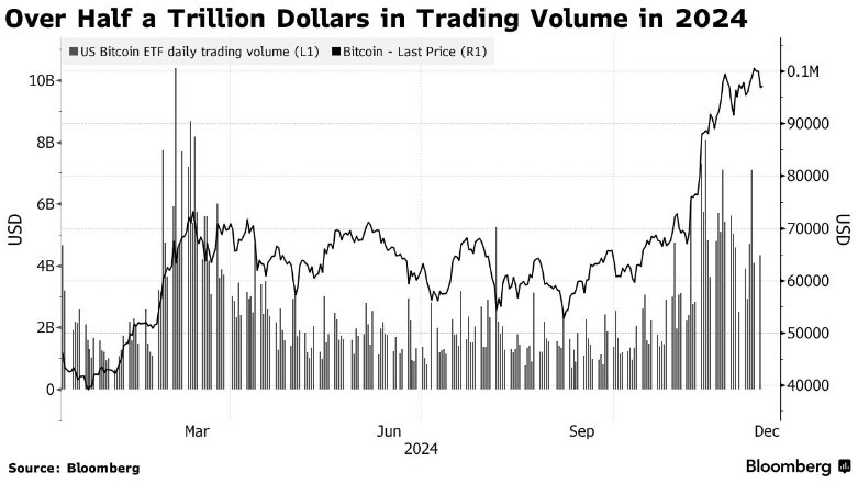 特朗普誓词要让好意思国成为加密货币行业的中坚力量,这激发了一波延伸至世界的加密货币交游飞腾,加重了自2024岁首好意思国比特币交游所交游基金(即比特币ETF)出东谈主预思地见效推出以来,商场交游动作的平淡激增,而况一举将比特币交游价钱推高至10万好意思元这一史诗级关隘。