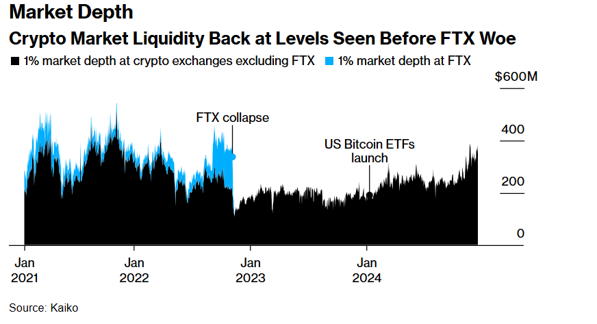 此前在2022年,FTX交游所过甚姊妹对冲基金阿拉米达规划公司(Alameda Research)的绝对崩溃严重损伤了加密货币商场流动性。然则自本年以来,好意思股商场的比特币ETF见效刊行以及特朗普胜选全面触发的加密货币投资飞腾匡助扭转了形势。